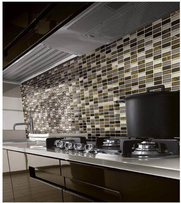GIAVA Series. Mosaic in dark emperador marble and shiny glass tiles. Easy to match, it adapts to modern but also more rustic environments, the shades with which it was designed also make it easy to match with various types of furniture.