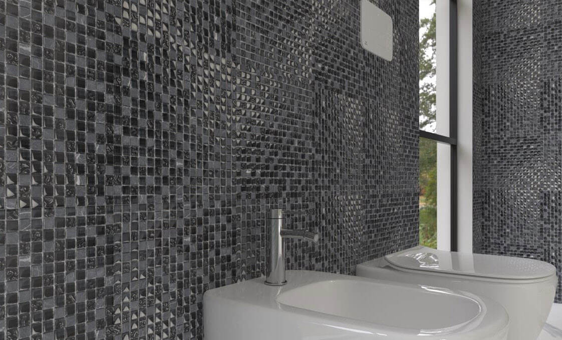 SIRTE Series. Mosaic in antiqued marble mixed with glass tiles both matt and glossy structured. Mosaic in two colors, one soft and one very strong, the structured movement of the glass will make this article the true protagonist of your environment, whether it is a large space or a small niche it will be noticed by giving particular attention to details.
