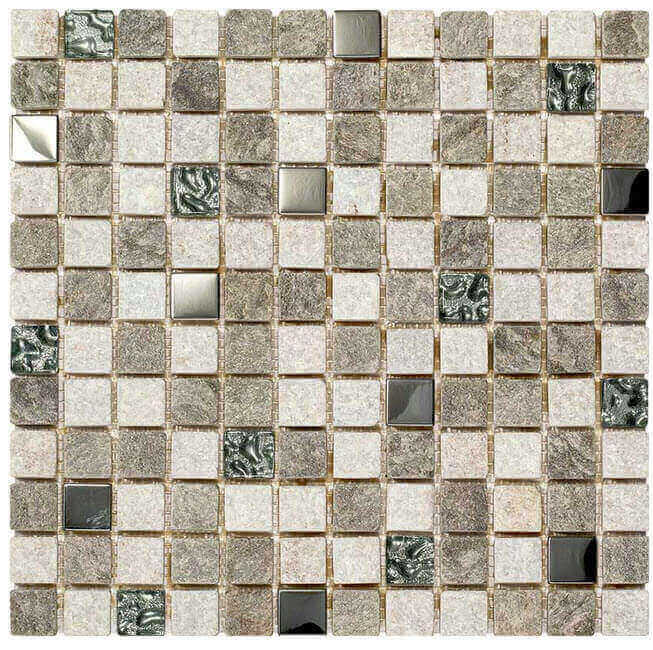 CHAMONIX Series. Quartzite mosaic in various colors and antique finish, combined with shiny glass tiles with a reflective effect and tiles with a stainless steel cap. It will make the rooms elegant and delicate, without sacrificing a great effect.