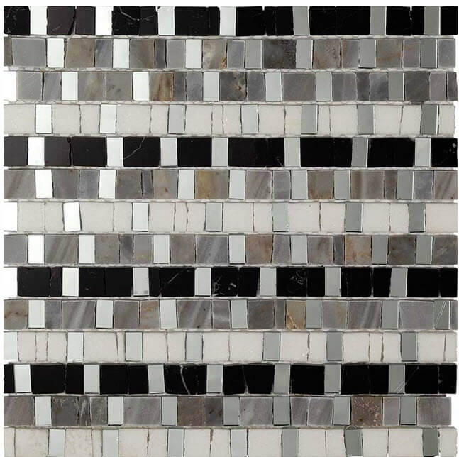MIRROR Series. Mosaic with a mixture of different colors of lapped marble, combined with glass/mirror tiles. An ultra-modern latest-generation covering that gives reflections of light and color. This mosaic wants to go outside the box and plays with design, movement and then decoration.