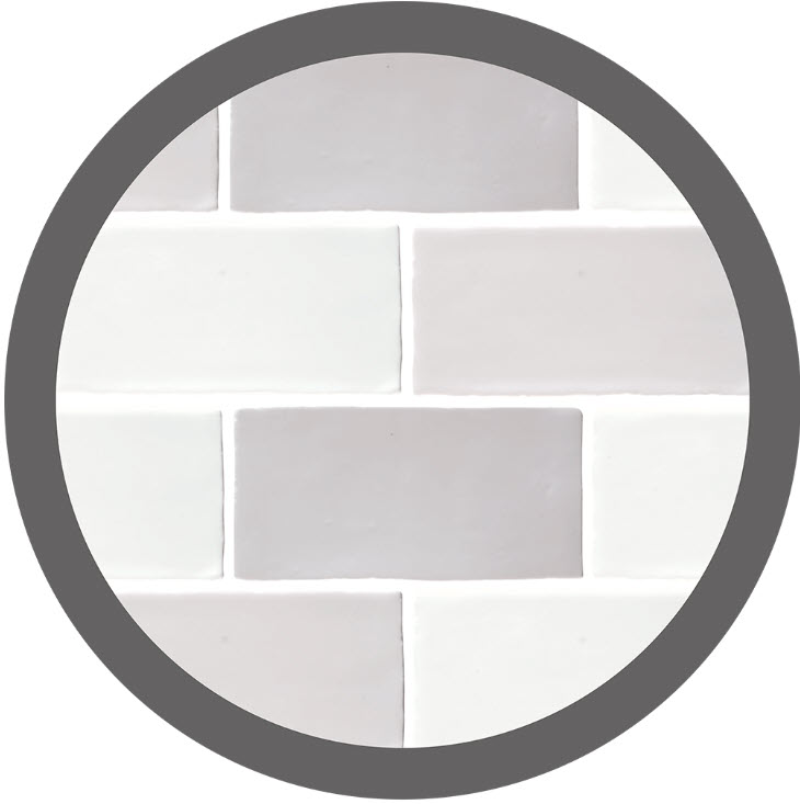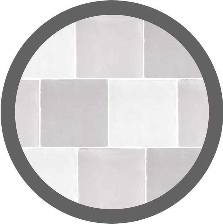 Antic Gris Mix , in sizes 13×13 cm and 7.5×15 cm, enamelled ceramic tiles, wall tile, uneven edges, colour mix of 3 colours, on red shard, shiny cracked and undulating surface, thickness 9 mm, mixture of colours and models, artisanal style, recommended joint of 3 mm.
