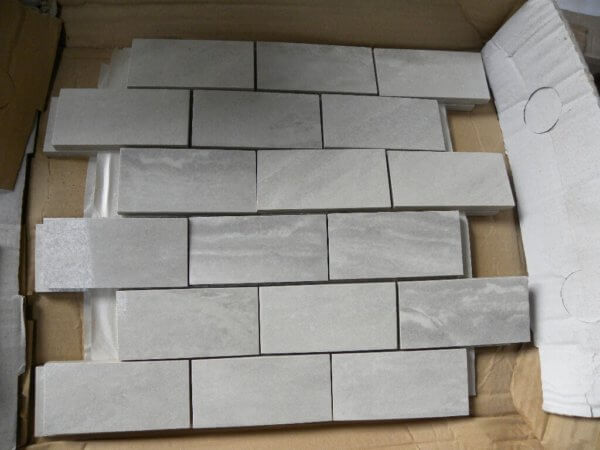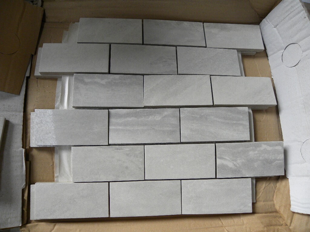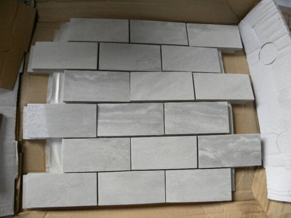 rest van een lot, keramische mozaïek blokjes grijs in formaat 5×10 cm op vel van 31×31 cm, 3 netten resterend, 1,.50 €/vel, wordt verkocht per net.