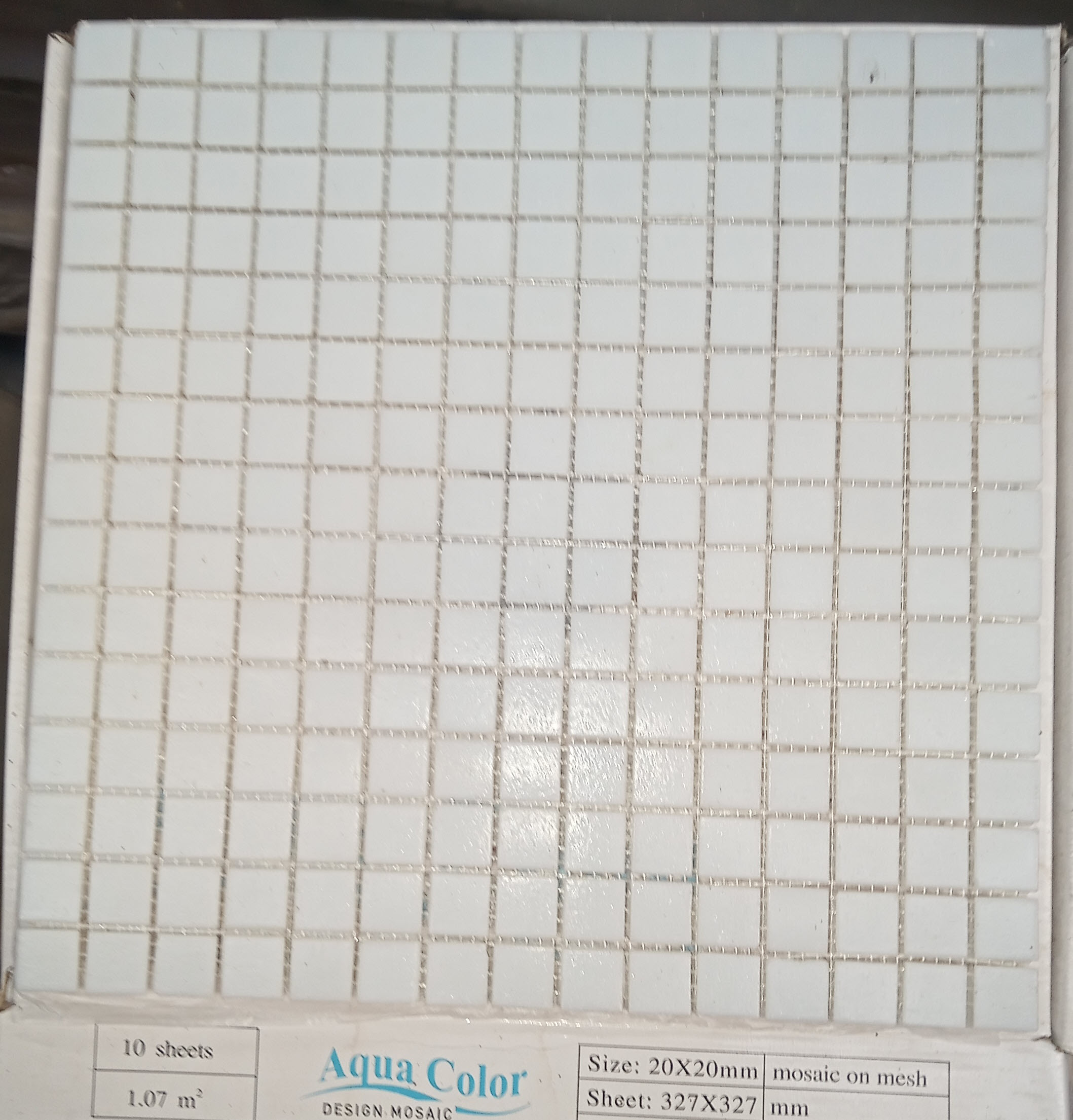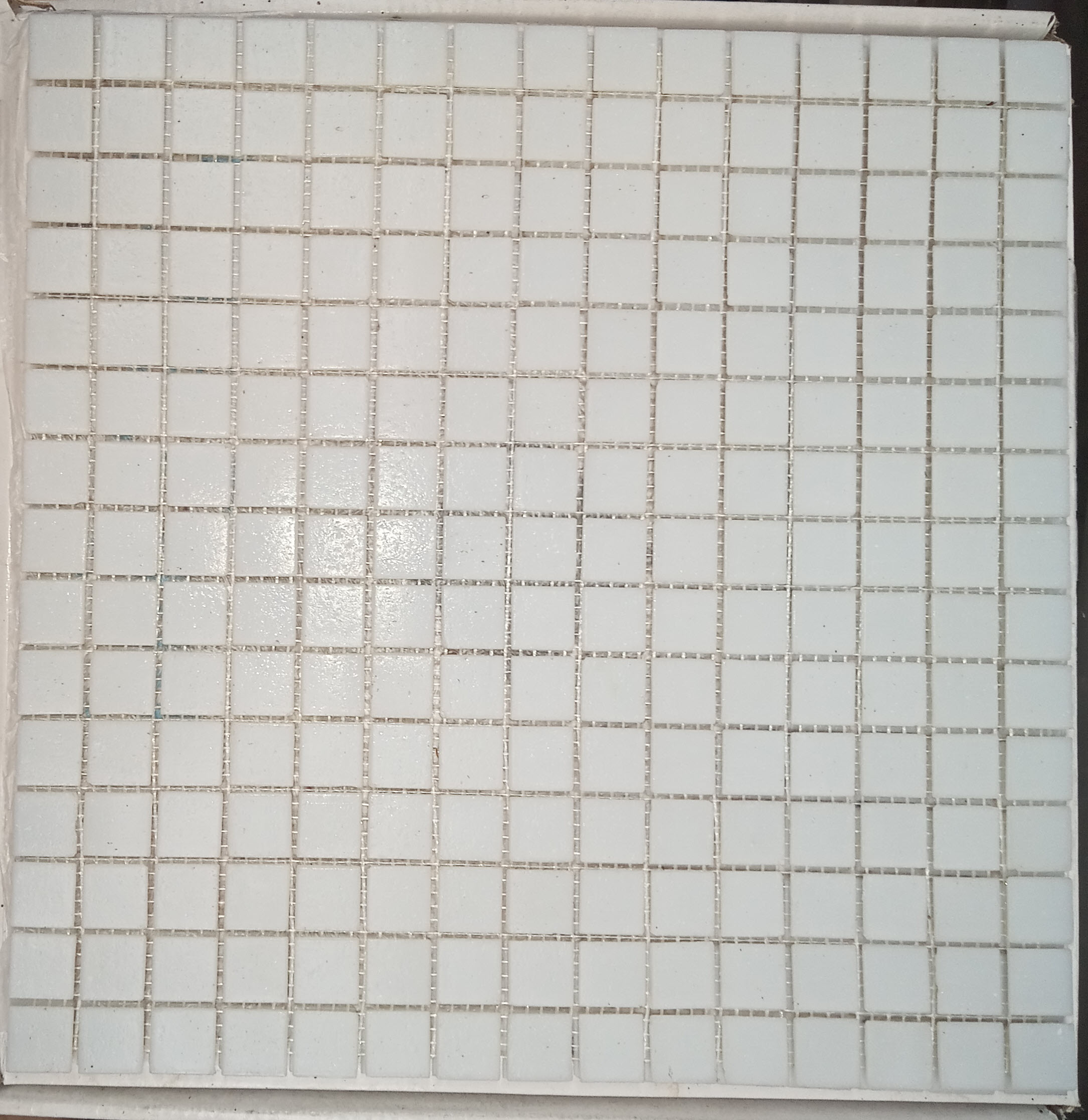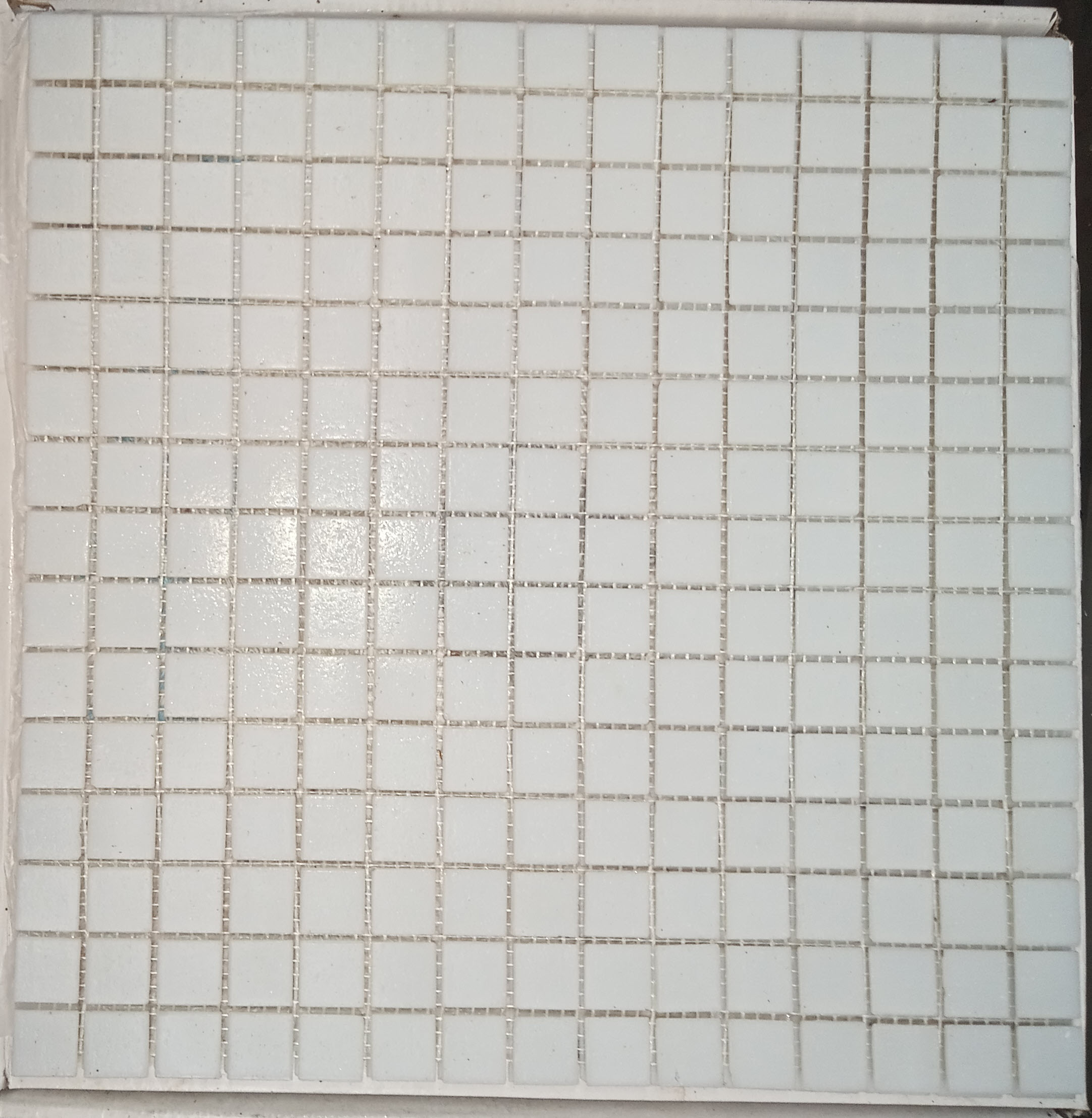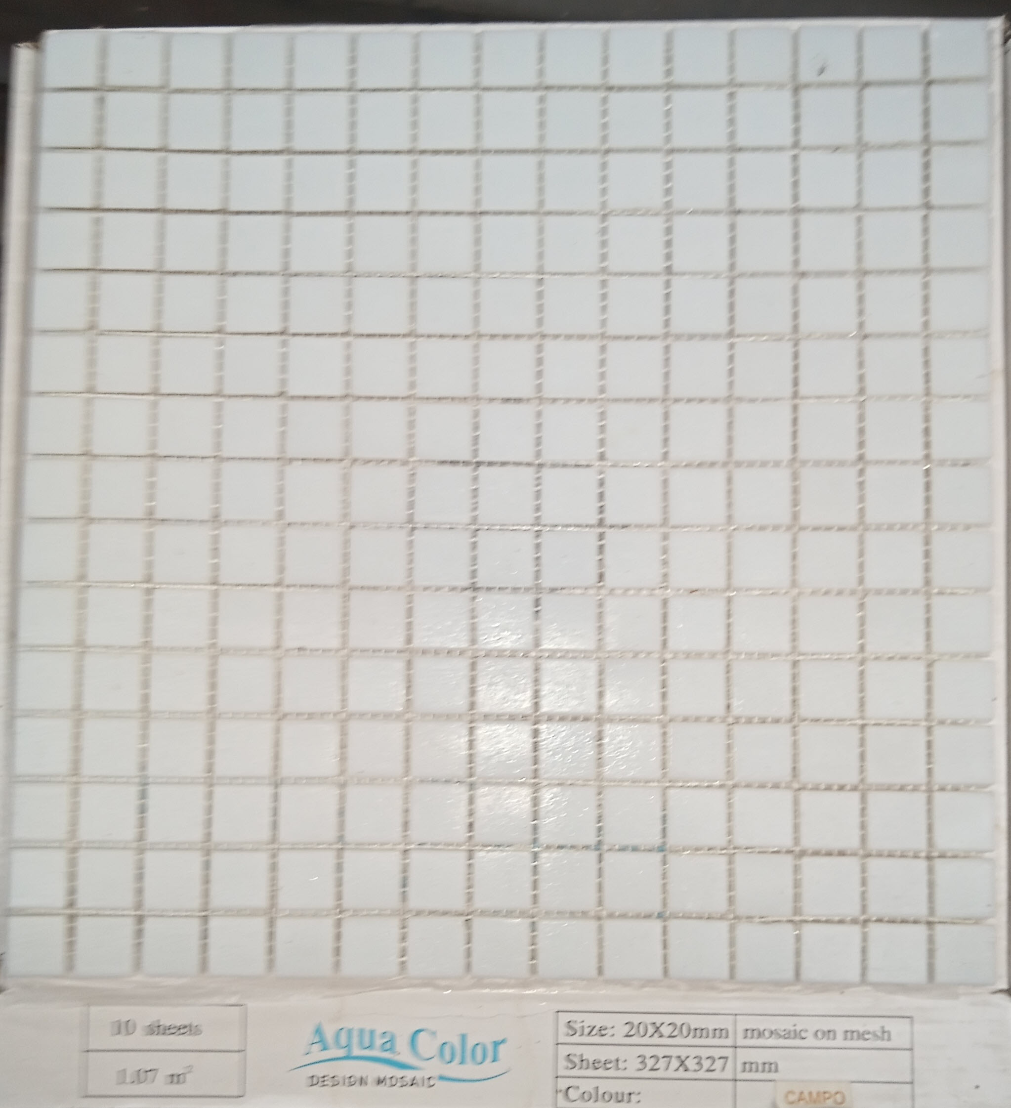 Campo Blanc , pâte de verre blanc cassé, format 20x20x4 mm sur trame de 316×316 mm, prix par boîte de 1.07 m² ou par trame de 316×316 mm . Il y a des petites cassures ici et la , de temps à autre sur un coin d’un chip. Après le jointoiement cela ne se voit plus.