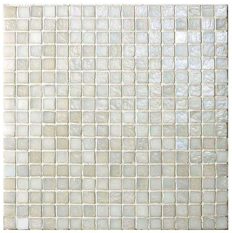 Canoë K , glass mosaic , colour white grey mix , semi glossy, finishing antique , format 16.2×16.2×6 mm on net of 318×318 mm .