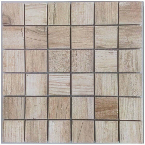 Forest Beige , mosaïque grès cérame , chip format 4.6×4.6 cm sur trâme de 29×29 cm. Couleur beige clair et foncé , marron , effet bois .