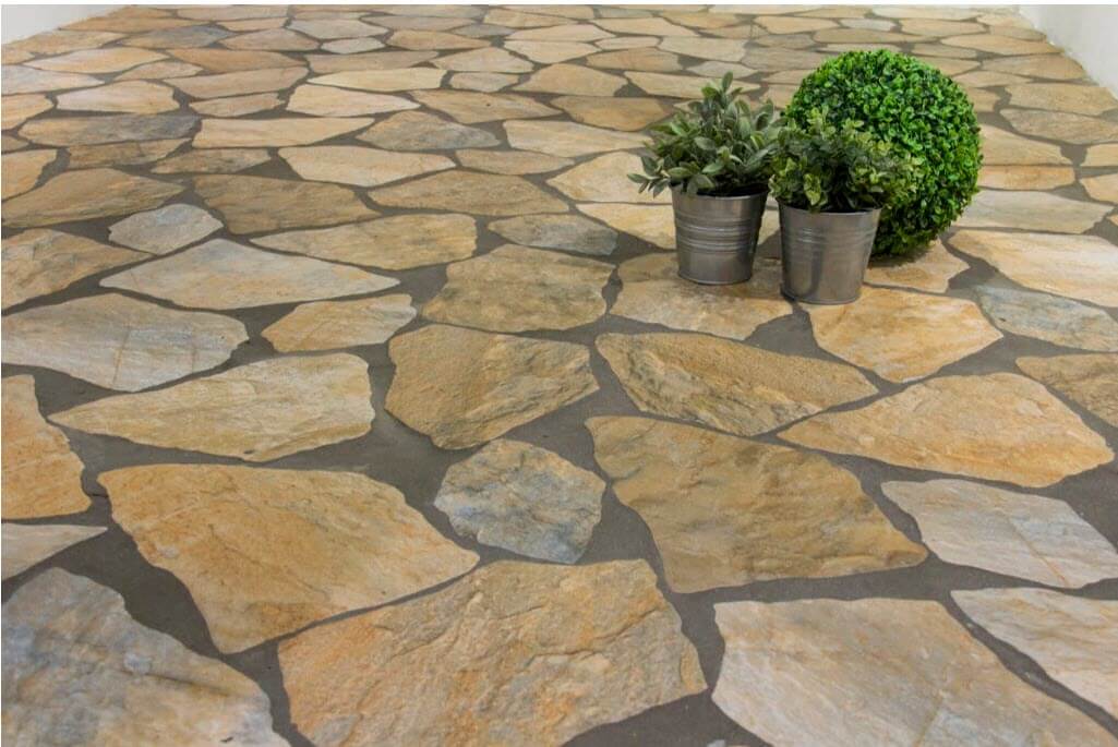 De serie Montesa is een keramische vloertegel met de look van flagstones. 3 verschillende reliëfs en 48 verschillen motieven en vormen in de tegels. De randen zijn onregelmatig afgewerkt net als echte flagstones, waardoor het formaat 32×42 cm een indicatie is. Deze keramische vloertegel is 11 mm dik wat beduidend dunner is dan echte flagstones, waardoor de tegels op een vlakke ondergrond gelijmd moeten worden en niet geschikt is voor een ondergrond van zand en mortel. Door de R12 antislip waarde is deze tegel geschikt voor uw terras, maar ook geschikt voor binnen en als wandtegel. De PEI is II.