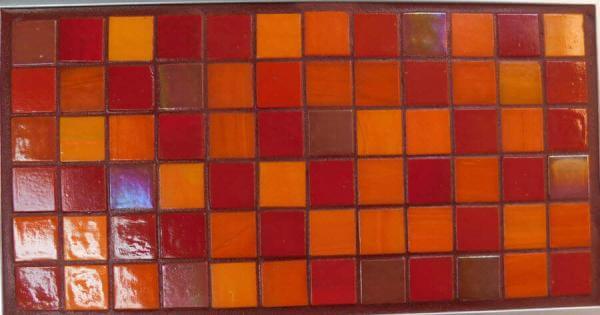 Rhone , mix of red and orange coloured glass mosaic, chip format 20x20x4 mm, on net of 316×316 mm.