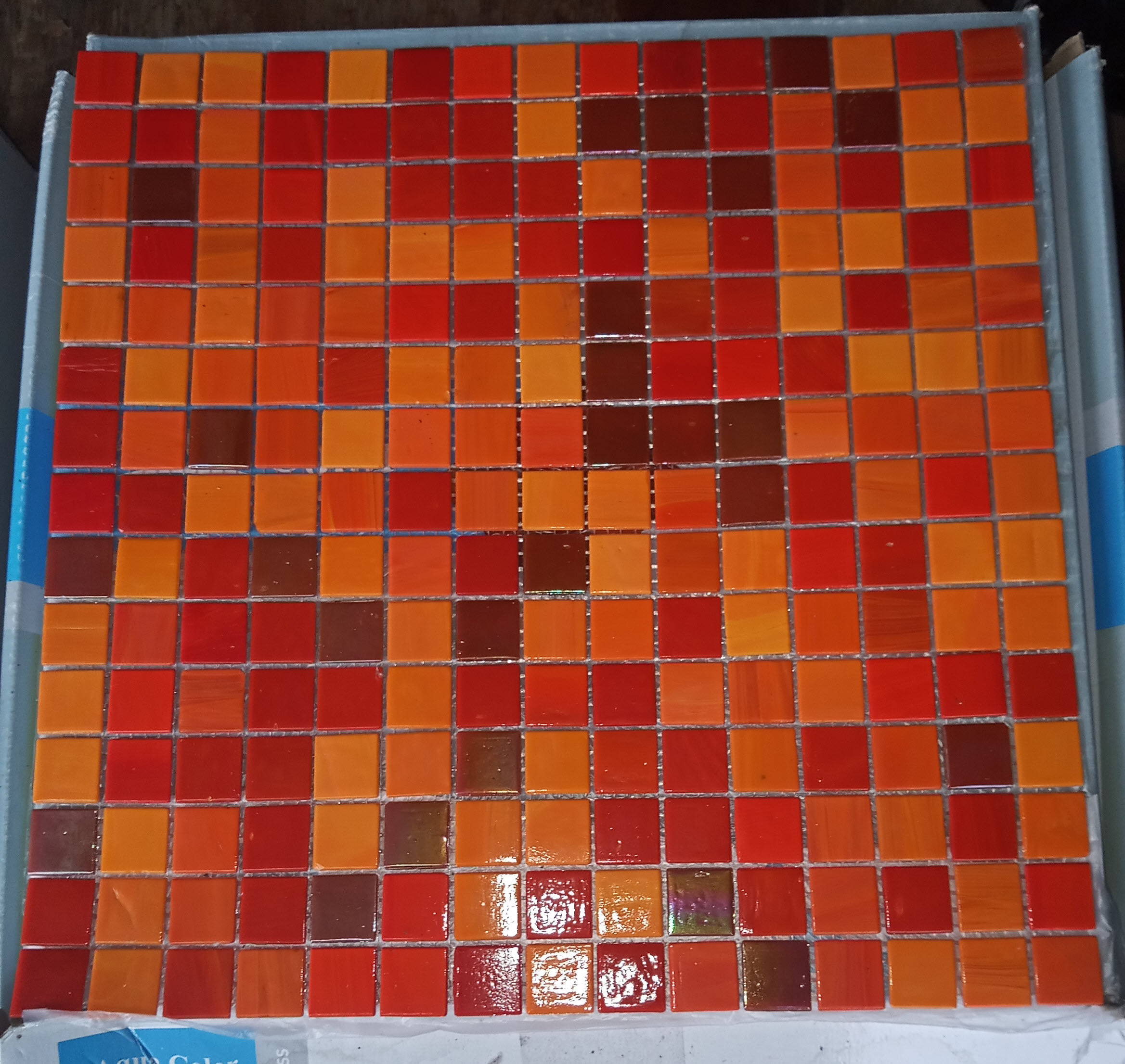 Rhone , mélange de pâte de verre rouge et orange , format 20x20x4 mm sur trâme de 316×316 mm.