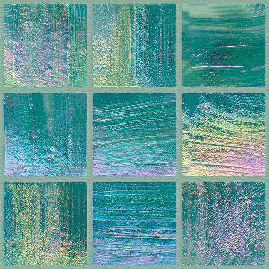 Shining 853 , mozaïek in chip formaat 2×2 cm op net van 31.6×31.6 cm , dikte van de chip 4 mm .  Ondoorzichtig  glas , textuur geweven met vlam en afgeschuind. Blinkend effect .