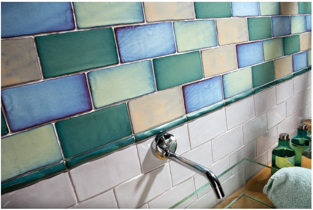 Milk , size 7.5×15 cm , enamelled ceramic tiles, wall tile, uneven edges, colour white honed, on red sharf, mate undulating surface, thickness 9 mm, mixture of colours and models, artisanal style, recommended joint of 3 mm.