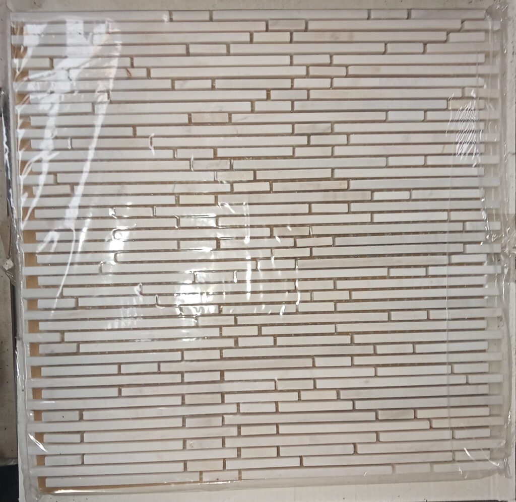 Super Slim Mosaic H06 , white carrara natuursteen mozaiek, formaat 0.5 cm/vrije lengte max 10 cm op vel van 30.5×30.5 cm, kleur wit carrara marmer, origine Vietnam .