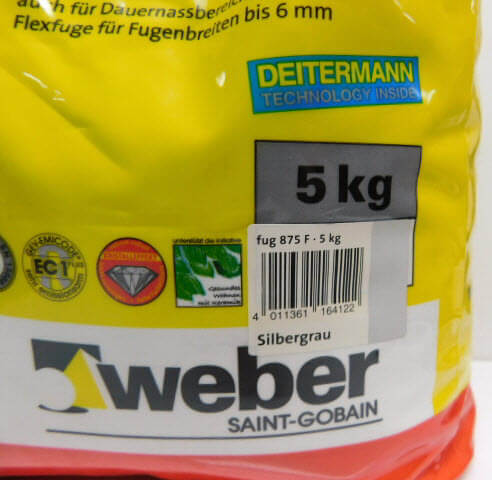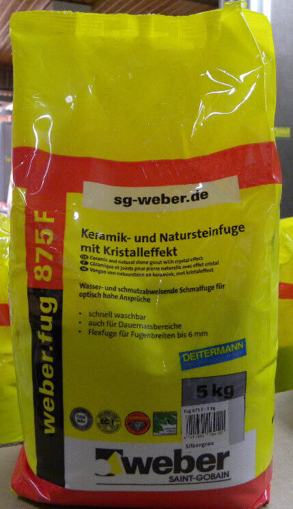 Weber.Fug 875 F Silbergrau , joint pour céramique et pierre naturelle avec effet cristal, couleur gris argent , joints étroits hydrofuges et anti-salissants pour des résultats esthétique de haute qualité , rapidement lavable, convient également pour les zones en permanence immergées, joints flexible jusqu’à 6 mm de largeur, aussi bien pour intérieur que pour extérieur, aussi pour revêtements chauffants.