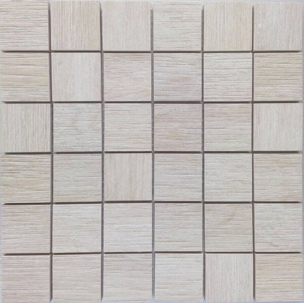 Wood Beige , mosaïque grès cérame , chip format 4.6×4.6 cm sur trâme de 29×29 cm. Couleur beige clair nuancé , effet bois .